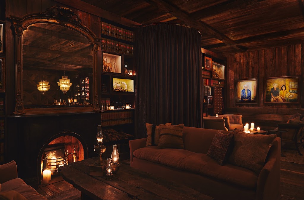 Bottom image description: A view of the sofa seating area next to a fireplace, candlelight, and wall displays with small taxidermy displays.