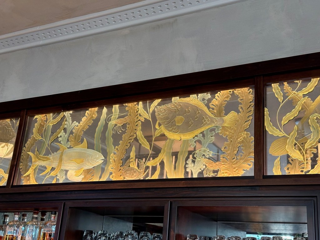 Image description: A close up of gold-colored accents on the wall over the bar. An ocean scene is depicted.